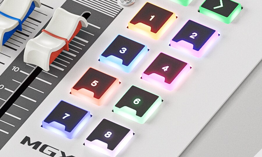 Los ocho pads y las cuatro perillas ubicadas en la parte frontal derecha de la MGX también funcionan como teclas personalizables definidas por el usuario. Sus asignaciones se pueden gestionar en cuatro bancos, lo que permite configurarlos según tus necesidades; por ejemplo, disparar Sound Pads, llamar escenas o reproducir un tono de prueba desde el oscilador integrado para pruebas de sonido en el recinto.